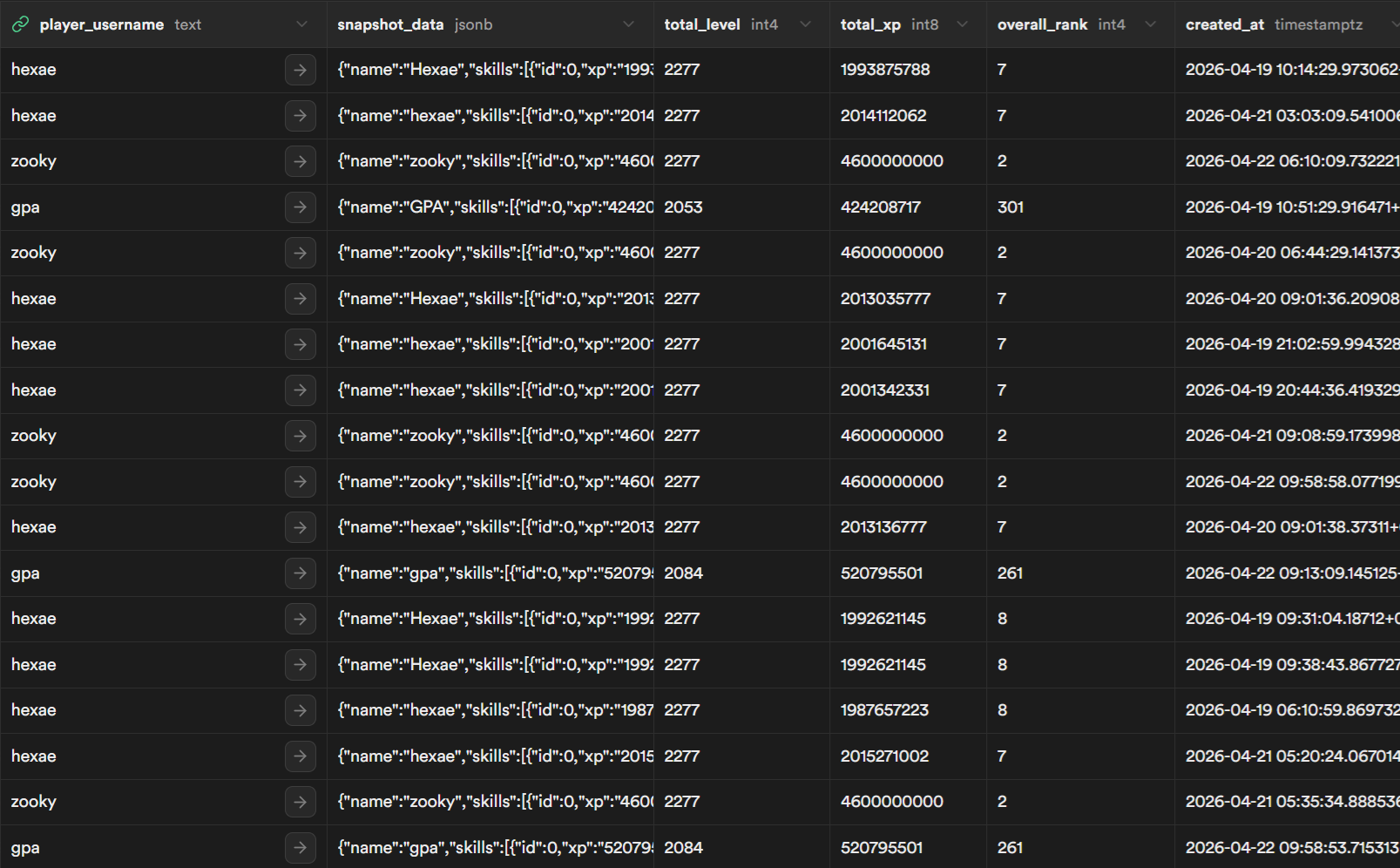 Every search saves a snapshot, building a history of player progression.